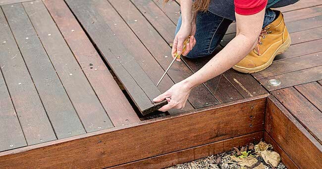Аккуратно приподнимите поврежденную доску и извлеките ее из системы лаг. Если доска прикручена саморезами (устаревший метод), вам потребуется шуруповерт, чтобы выкрутить крепежи.